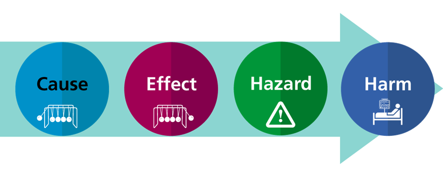 Before a hazard occurs, there’s often a cause (the initiating event) that leads directly to an effect (the immediate consequence). The hazard, if unaddressed, can then lead to harm (the ultimate negative outcome for the patient).