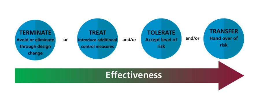 - Terminate: Avoid or eliminate the risk through design change (the most effective).